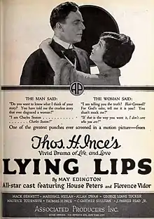 Lying Lips is a 1921 American silent drama film directed by John Griffith Wray and starring House Peters, Florence Vidor, and Joseph Kilgour. Produced by the independent producer Thomas H. Ince for the short-lived Associated Producers company, the film was a financial success, grossing $446,000 against a budget of $263,000.[1] It is based on a story by the British writer May Edginton.