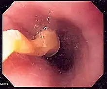 Food bolus impaction is a common complication of lymphocytic esophagitis.[1] This occurs when food is acutely obstructing the esophagus at an area of narrowing. It typically requires an endoscopic procedure in order to remove or dislodge the obstructing food.