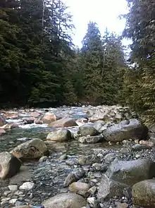 The Lynn Loop Trail is an estimated 1.5-hour trail, with a round trip distance of 5.2 km (3.2 mi).[9] This walk guides you along a slight incline adjacent to the fresh water creek, and through the mountains and forest of North Vancouver. As you walk over the bridge and past the rushing water of Lynn Creek with Mount Fromme in the backdrop, to your left there will be wooden fence where the Lynn Loop trail begins. This path parallels the Lynn Creek waters for roughly two kilometers, then loops up into a deeper part the forest with varying steep sections. Nearing the end, the incline returns to normal, bringing hikers back to the bridge area.