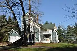 Lynnwood is a historic house at 5 Linden Avenue in Wakefield, Massachusetts. Built c. 1858, it is one of the town's finest examples of Stick style architecture. It is a 1+1⁄2-story wood-frame structure with an L-shaped cross-gable configuration; its features include deep eaves supported by arched brackets, and a 3+1⁄2-story tower topped by a hip roof with triangular dormer windows. Its eaves have brackets with pendants, and its windows have surrounds with drip molding.[2]