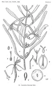 L. exocarpi was first collected from Spencer's Gulf in 1802 by Robert Brown.[39] It was first described as Loranthus exocarpi by Hans Hermann Behr in 1847[40] after his first visit to Australia 1844-45. Behr was the first botanist to systematically collect and study the flora of the Barossa Range, mallee scrubs towards the River Marne and areas adjacent to the River Murray at Moorundie. Dietrich von Schlechtendahl treated 200 plants collected by Behr, of which he described 62 as being new species: a further five, including Loranthus exocarpi were described by Behr.[41] In 1894 Philippe Édouard Léon Van Tieghem published a revision of Loranthus and created a new genus Lysiana. The name is based on the Greek lyo - "I set free" - referring to the separation of the genus from Loranthus.[42]