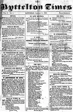 The Canterbury Association was formed in order to establish a colony in what is now the Canterbury Region in the South Island of New Zealand. Part of the plan was to have a newspaper, and a prospectus was published in August 1850.[2] The Canterbury Association entered into a contract with Ingram Shrimpton, of the Crown Yard Printing Office, Oxford, to send out the necessary plant in one of the First Four Ships to Lyttelton.[3] The printing equipment arrived on the Charlotte Jane on 16 December 1850, and the first edition of the Lyttelton Times was published less than one month later on 11 January 1851.[4]