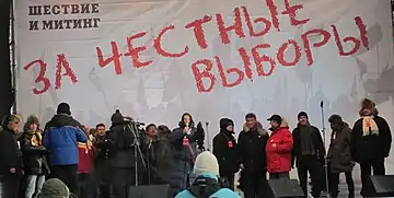 Because Ulitskaya addresses both religion and politics in her work, she has moved to the forefront of the Russian political debate in recent decades. In 2011 and 2012, during the height of the anti-Putin protests in Russia, she became a board member for the League of Voters. She was also considered a traitor by the administration and was the subject of negative statements in state-owned outlets, such as Isvestia.[5] She is firmly anti-Putin; at a press conference for her book The Big Green Tent (Зелёный шатёр, 2010), she remarked that the country was becoming "Stalinized," something that gave her "a whiff of fear."[6]