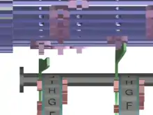 The left guide arm is prevented from interacting with the lugs (purple) on the drum (blue), while the right guide arm is in an effective position, and will push to the left any bars with a lug in that position.