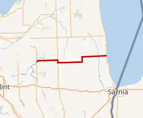 M-90 starts at an intersection with M-24 in Deerfield Township in northern Lapeer County. The intersection is near the Lapeer State Game Area. After a short jog northeast to cross the Flint River, it runs due east on North Branch Road through rural farmland. The highway passed through North Branch on its way to M-53 in Burnside Township. There it turns south and runs concurrently with M-53 on Van Dyke Road for about 1.5 miles (2.4 km) before turning east on Burnside Road. M-90 continues east to pass through Brown City near the Sanilac County line.[3][4] In Brown City, M-90 follows Main Street and crosses a branch of the Huron and Eastern Railway before it becomes Burns Line Road.[4][5] South of Peck, M-90 turns north along M-19 on Brockway Road. M-90 once again turns east as a solo route on the east side of Peck and follows Peck Road. The trunkline crosses the Black River on the south side of Croswell before ending at M-25 near Lake Huron in Lexington.[3][4]
