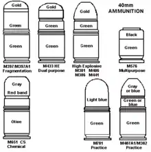 - (M406) high-explosive round. The HE round has an olive drab aluminum skirt with a steel projectile attached, gold markings, and a yellow ogive. It arms between 14 and 27 meters, produces a ground burst that causes casualties within a 130-meter radius, and has a kill radius of 5 meters.[9]