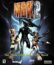 MDK2 is a 2000 third-person shooter, action-adventure video game developed by BioWare and published by Interplay Entertainment for the Dreamcast, Windows and PlayStation 2. It is a sequel to the 1997 game MDK. First released for the Dreamcast in March 2000, it was later released for Windows in May, with newly selectable difficulty levels and the ability to manually save. In March 2001, a slightly reworked version, featuring level design modifications and gameplay tweaks, was released for the PlayStation 2 as MDK 2: Armageddon. The PC version was released on GOG.com in September 2008,[6] and on Steam in September 2009.[7] A port of the PlayStation 2 version was released for Wii via WiiWare in 2011. Also in 2011, a HD remastered version was released for Windows. Called MDK2 HD, this version features new 3D models, textures, improved lighting, and remastered music, and was released on Beamdog in October, and on Steam in July 2012.