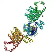 mDia1 (also known as Dia1, Drf1 for Diaphanous-related formin-1, Diaph1, KIAA4062, p140mDia, mKIAA4062, or D18Wsu154e) is a member of the protein family called the formins and is a Rho effector. It is the mouse version of the diaphanous homolog 1 of Drosophila. mDia1 localizes to cells' mitotic spindle and midbody,[1] plays a role in stress fiber and filopodia formation, phagocytosis, activation of serum response factor, formation of adherens junctions, and it can act as a transcription factor.[2] mDia1 accelerates actin nucleation and elongation by interacting with barbed ends (fast-growing ends) of actin filaments. The gene encoding mDia1 is located on Chromosome 18 of Mus musculus and named Diap1.