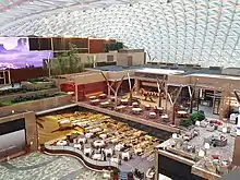 Designed by Kohn Pedersen Fox Associates, it was constructed at a cost of $3.4 billion.[6][7] The unique structure has the appearance of nine jewel-like boxes stacked upon each other, forming two interconnected towers. Its exterior is coloured gold, silver, and bronze similar to the MGM Macau. In 2018, the hotel won the Emporis Skyscraper Award.[6] MGM Cotai, with a total floor area of 280,000 sqm, has 1,390 rooms and suites including 16 skylofts and 27 mansion villas.[2] The hotel's atrium connecting the main lobby to shops and restaurants, named The Spectacle, features the world's largest free-span gridshell glazed roof that is self-supporting.[8] 125 gaming tables have been allocated to the property's casino, of which 100 were allocated at launch and the remaining 25 to be allocated in 2019. A further 77 tables transferred from MGM Macau have been authorised by the government, bringing the total to 177 gaming tables.[1]