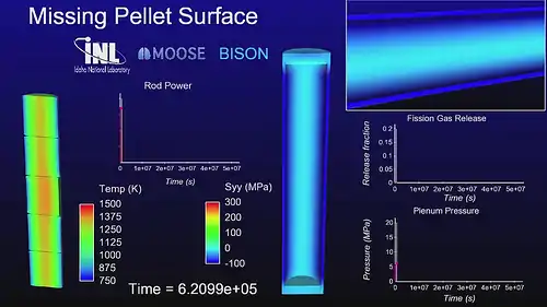 BISON was the first MOOSE-based application "animal," and is a finite element-based nuclear fuel performance code applicable to a variety of fuel forms including light water reactor fuel rods, TRISO fuel particles, and metallic rod and plate fuel.[5][6][7] It solves the fully coupled equations of thermomechanics and species diffusion and includes important fuel physics such as fission gas release and material property degradation with burnup. BISON is based on the MOOSE framework[8] and can therefore efficiently solve problems on either two-dimensional axisymmetric or three-dimensional geometries using standard workstations or large high performance computers. Plasticity, irradiation growth, and thermal and irradiation creep models are implemented for clad materials. Models are also available to simulate gap heat transfer, mechanical contact, and the evolution of the gap/plenum pressure with plenum volume, gas temperature, and fission gas addition. BISON is also coupled to a MOOSE-based mesoscale phase field material property simulation capability.[9][10]
