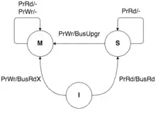 - On a BusRdX, the cache block is flushed onto the bus and state changes to Invalid.[2]