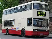Merseymaid and Silver Service were brand names for cross-river double-deck Merseybus services between Liverpool and the Wirral via the Mersey Tunnels. Initially, a Willowbrook bodied Leyland Atlantean and five Alexander R-Type Leyland Olympians were refurbished at the Edge Lane works with soft trim, internal address systems and coach seats in November 1992, before then operating on routes 410 and 411 from Eastham to Liverpool. To attract passengers, the drivers of 'Silver Service' buses were given special customer care training, while MTL advertised a weekly ticket lower than four days' tunnel toll fees.[18] At the end of 1995, this operation was augmented with a batch of 30 similar specification Northern Counties Palatine II bodied Volvo Olympians, which were also used on other cross-river services.[16] Silver Service branding was dropped inconspicuously during 1998.