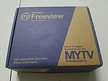 MYTV Broadcasting or MYTV is a Malaysian television broadcasting company providing free digital terrestrial television (DTT) in the country, considered a first of its kind in the country. [1] The DTT service is officially branded as myFreeview since August 2015, though the legal name of the company remained unchanged [2] A billion MYR deal have been signed with Telekom Malaysia to distribute the services.[3] The set top box has been available for sale as of February 2017, after long delays of building infrastructure and other issues.[4][5][6][7]
