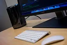 Apple said that an Intel-based replacement for the 2003's PowerPC-based Power Mac G5 machines had been expected for some time before the Mac Pro was formally announced on August 7, 2006, at the annual Apple Worldwide Developers Conference (WWDC).[3] In June 2005, Apple released the Developer Transition Kit, a prototype Intel Pentium 4-based Mac housed in a Power Mac G5 case, that was temporarily available to developers.[4] The iMac, Mac Mini, MacBook, and MacBook Pro had moved to an Intel-based architecture starting in January 2006, leaving the Power Mac G5 as the only machine in the Mac lineup still based on the PowerPC processor architecture Apple had used since 1994. Apple had dropped the term "Power" from the other machines in their lineup and started using "Pro" on their higher-end laptop offerings. As such, the name "Mac Pro" was widely used before the machine was announced.[5] The Mac Pro is in the Unix workstation market.[6] Although the high-end technical market has not traditionally been an area of strength for Apple, the company has been positioning itself as a leader in non-linear digital editing for high-definition video, which demands storage and memory far in excess of a general desktop machine. Additionally, the codecs used in these applications are generally processor intensive and highly threadable, which Apple's ProRes white paper describes as scaling almost linearly with additional processor cores. Apple's previous machine aimed at this market, the Power Mac G5, has up to two dual-core processors (marketed as "Quad-Core"), but lacks the storage expansion capabilities of the newer design.[5]