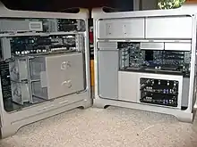 The case could be opened by operating a single lever on the back, which unlocked one of the two sides of the machine, as well as the drive bays. All of the expansion slots for memory, PCIe cards and drives could be accessed with the side panel removed and no tools were required for installation.[21] The Mac Pro's Xeon processors generated much less heat than the previous 2-core G5s, so the size of the internal cooling devices were reduced significantly.