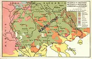 In an article published in June, 1902, the IMARO revolutionaries promoted the idea of autonomy and the slogans "Macedonia for the Macedonians".[11] The Organization gave a guarantee for the preservation of all national communities there, and insisted that the Bulgarians could be proud of their tolerance, in opposition to Romanians, Serbs and Greeks. They also planned that the administration of the future autonomous Macedonia will rely on the Bulgarian majority. In the same year the Organization changed its exclusively Bulgarian character,[12] and opened it to all Macedonians and Thracians regardless of nationality, who wished to participate in the anti-Ottoman movement.[13] Those revolutionaries saw the future autonomous Macedonia as a multinational polity, and "Macedonian" was an umbrella term covering Greeks, Bulgarians, Turks, Vlachs, Albanians, Serbs, etc.[14] Nevertheless, the British Consul in Skopje Raphael Fontana wrote on the occasion of the Ilinden uprising in 1903 that the revolutionaries were working for a general Bulgarian uprising in order to reach their goal of "Macedonia for the Macedonians", understood to mean "Macedonia for the Bulgarians".[15] According to the prevailing view in the Bulgarian historical science, the idea of autonomy represented only a tactics aiming at the eventual unification with Bulgaria.[16] Some independent researchers suggest that behind the slogan "Macedonia for the Macedonians" there was a backup plan for the incorporation of Macedonia into the Bulgarian state.[17][18]