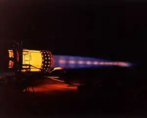 As the exhaust passes through the normal shock wave, its temperature increases, igniting excess fuel and causing the glow that makes the shock diamonds visible.[2] The illuminated regions either appear as disks or diamonds, giving them their name.