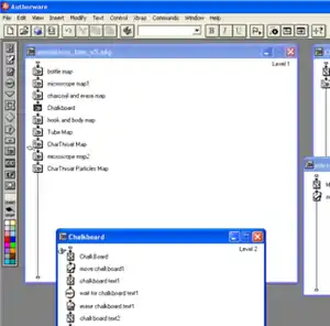 Authorware used a visual interface with icons, representing essential components of the interactive learning experience. "Authors" placed icons along a “flowline” to create a sequence of events. Icons represented such components as Display—put something on the screen, Question—ask the learner for a response, Calc—perform a calculation, read data, and/or store data, and Animate—move something around on the screen. By simply placing the icons in sequence and adjusting their properties, authors could instantly see the structure of program they were creating and, most importantly, run it to see what learners would see. On-screen changes were easy to make, even while the program was running.