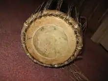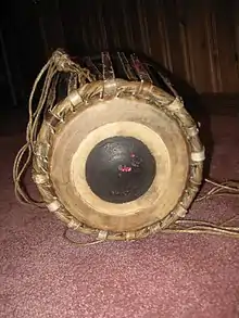 The Maddale (Kannada: ಮದ್ದಲೆ) also called Mrudanga(ಮೃದಂಗ) in North Canara region is a percussion instrument from Karnataka, India. It is the primary rhythmic accompaniment in a Yakshagana ensemble along with Chande. Maddale also represents a remarkable progress in percussive instruments as it produces the perfectly hormonic tonic (shruti swara) when played anywhere on the surface compared to Mrudangam, Pakawaj or Tabla that can not produce the tonic (shruti) on all parts of the drum surface. The traditional variety of Maddale was 30 cm long, had 8 inch drum head for right and produced the louder sound. These days 6 - 6.5 inch wide right side maddale is used with only a few using 7 inch wide. Left bass side is about an inch (few hairs less) bigger than right. Maddale is available in more than three different variations.[1] Maddale used in Yakshagana looks similar to mridangam but is markedly different in structure, acoustics, playing techniques and the rhythm system (Yakshagana Tala).[2]