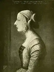 Maddalena de' Medici (25 July 1473–2 December 1528) daughter to Lorenzo Medici[1] Born in Florence, she was educated with her siblings to the humanistic cultures by figures such as Angelo Poliziano.[2] In February 1487 she was engaged to be married to Franceschetto Cybo, son of Pope Innocent VIII.[3] They were married in January 1488, and she brought a dowry of 4000 ducats.[3] This marriage brought closer connections for her family and the Vatican, helping her brother Giovanni get appointed as a cardinal.[3] She used her influence with her father, her brother Piero, and the pope to help friends and poorer people get aid and positions within the church and governments.[4]