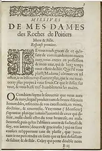 Contemporaries of Pierre de Ronsard, and friends of the humanist Estienne Pasquier, Madeleine Des Roches and her daughter were the center of a literary circle based in Poitiers between 1570 and 1587, and which included the poets Scévole de Sainte-Marthe, Barnabé Brisson, René Chopin, Antoine Loisel, Claude Binet, Nicolas Rapin and Odet de Turnèbe.[2] The circle is best known for a collection of gallant verse (in French, Italian, Latin and Greek) entitled La Puce de Madame Des Roches ("The Flea of Madame Des Roches", published 1583) in which the poets, inspired by an original poem by Pasquier, wrote on the theme of a flea upon Catherine's throat.[2] Des Roches is now seen as an important successor of the literary legacy of Christine de Pizan, arguing as de Pizan did for the necessity of a "City of Ladies", a literary community of women.[3]