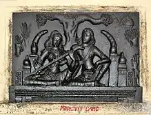 Madhavi was the daughter of a dancer, Chitrapahti; they were believed to have a long ancestry, starting with the apsara Urvashi. Madhavi was rigorously trained in music, dance and composition of poems. Kovalan, the son of a wealthy merchant and the husband of Kannagi, met Madhavi in a performance in Chozha king Karikalan's court. Enamoured of her beauty, he fell in love with her. Eventually, Kovalan left his wife and moved in with Madhavi, with whom he stayed for a year. Madhavi bore him a daughter Manimekalai. However, after spending all his money on Madhavi, he realised his mistakes and returned to his wife Kannagi.[2]