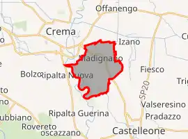 Madignano (Cremasco: Madignàa) is a comune (municipality) in the Province of Cremona in the Italian region Lombardy, located about 45 kilometres (28 mi) southeast of Milan and about 35 kilometres (22 mi) northwest of Cremona. As of 31 December 2006, it had a population of 2,977 and an area of 10.8 square kilometres (4.2 sq mi).[3]