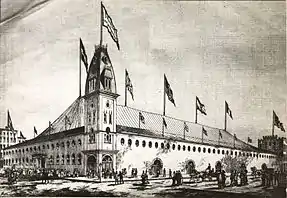 The site upon which Madison Square Garden was eventually established was originally occupied by a small passenger depot of the New York and Harlem Railroad. The site was vacated by the railroad in 1871 when it moved operations uptown to Grand Central Depot at 42nd Street.[1] The site was vacant until 1874 when it was leased to P. T. Barnum who converted it into an open oval arena 270 feet (82 m) long, with seats and benches in banks, which he named the Great Roman Hippodrome[1] where he presented circuses and other performances. The roofless building was also called Barnum's Monster Classical and Geological Hippodrome and measured 420 feet (130 m) by 200 feet (61 m).[1]