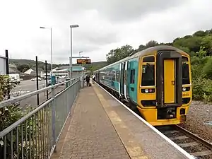 The station is unstaffed and has a single platform with waiting shelter, CIS display, customer help point, timetable information board and self-service ticket machine next to the main entrance. The latter can be used for collecting pre-paid tickets as well as for purchasing tickets prior to travel. Level access is available between the car park and platform.[1] The platform was lengthened in 2008 to allow four-car trains to operate busier services. This was funded by the Welsh Assembly Government and the European Union.