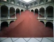 In her monumental 1992 installation Domestication of the Pyramid, she placed a pyramid made of red quartz sand inside the architecturally ornate Museum of Applied Arts, Vienna.[13] In the next two years it was also installed in Dublin, Martin-Gropius-Bau, Berlin, Rottweil, and Warsaw.[4] The red quartz sand takes over the museum space, piling over railings, stairways, and hallways, falling through the space in a way that feels like an avalanche. The work served as a visual metaphor for the Western tradition of taking important parts of our, and others, history and placing them inside of museums.[14]