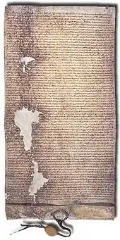 John held a council in London in January 1215 to discuss potential reforms, and sponsored discussions in Oxford between his agents and the rebels during the spring.[21] Both sides appealed to Pope Innocent III for assistance in the dispute.[22] During the negotiations, the rebellious barons produced an initial document, which historians have termed "the Unknown Charter of Liberties", which drew on Henry I's Charter of Liberties for much of its language; seven articles from that document later appeared in the "Articles of the Barons" and the subsequent charter.[23][24][25]
