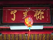 Afterwards, Magong Chenghuangye named Lin Ying Hou (Chinese: 靈應侯; pinyin: líng yīng hóu ) as well.[5] The meaning of Lin Ying Hou, its first character Lin (靈) means "spirit"; and the second character Ying (應) means "feel" or "answer"; the third character Hou (侯), means " one of ranks of Chinese nobilIty". So, Lin Ying Hou (靈應侯) means that this lord of god who will show its spirit to answer you, or you can feel the spirit appear.