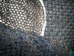 Kusari was used in samurai armour at least from the time of the Mongol invasion (1270s) but particularly from the Nambokucho Period (1336–1392).[40] The Japanese used many different weave methods including a square 4-in-1 pattern (so gusari), a hexagonal 6-in-1 pattern (hana gusari) and a European 4-in-1 (nanban gusari).[41] The rings of Japanese mail were much smaller than their European counterparts; they would be used in patches to link together plates and to drape over vulnerable areas such as the armpits.