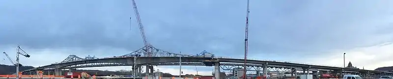 After considering a number of alternatives, including rehabilitation of only the original bridge, or construction of a new bridge and demolition of the original bridge, on August 23, 2012, the Minnesota Department of Transportation announced approval for plans to build a new two-lane concrete box girder bridge, prior to rehabilitating the original bridge.[3] Construction of the new bridge began immediately upstream of the cantilever bridge in July 2014, and opened for traffic in August 2016. Following the opening of the new bridge, the original cantilever bridge closed for rehabilitation.[4] The rehabilitated cantilever bridge opened July 1, 2019, allowing 2 lanes in each direction.[5][6]