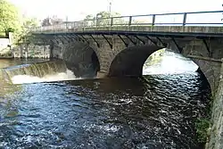 The Main Street Bridge is an historic bridge carrying Main Street over the Pawtucket Falls in Pawtucket, Rhode Island. The oldest portion of this bridge consists of two flattened-arch spans, each about 40 feet (12 m) in length, with a total bridge length of 110 feet (34 m). The bridge has been widened twice to accommodate increased traffic; the most recent widening was in the 1960s, when concrete abutments were added to the south, and the added section completed with I-beams. The bridge, built in 1858, is believed to be the oldest highway bridge in active use in the state.[2]