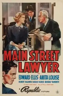 Main Street Lawyer is a 1939 American crime film directed by Dudley Murphy and written by Joseph Krumgold and Devery Freeman. The film stars Edward Ellis, Anita Louise, Robert Baldwin, Harold Huber, Clem Bevans and Margaret Hamilton. The film was released on November 3, 1939, by Republic Pictures.[1][2][3]