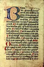 The Mainz Psalter was the second major book printed with movable type in the West;[1] the first was the Gutenberg Bible. It is a psalter commissioned by the Mainz archbishop in 1457. The Psalter introduced several innovations: it was the first book to feature a printed date of publication, a printed colophon, two sizes of type, printed decorative initials, and the first to be printed in three colours.[1] The colophon also contains the first example of a printer's mark.[2] It was the first important publication issued by Johann Fust and Peter Schoeffer following their split from Johannes Gutenberg.