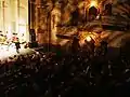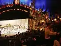Theatre features included a huge cast-iron canopy covering the sidewalk, a vertical sign 76-feet tall topped with "a strutting peacock ... walking as a huge ball rotated under his feet," and a cave-like single-story lobby that included copper lanterns, ceiling murals, and an aquarium filled with tropical fish.[7] Inside the theatre's auditorium were stuffed birds perched on balconies or frozen mid-flight via ceiling wire, replicas of well-known Greek, Roman, and Renaissance sculptures, and specially treated cypress trees brought from Spain and placed on upper-level niches. The Baroque tendency to decorate with mask-like faces is exemplified by carvings alongside the stage and under the mezzanine balcony, and in direct translation of atmospheric theater design, the Majestic's blue ceiling "cloud scape" disguises the interior dome as an evening sky in conjunction with a cloud projector and small bulbs simulating stars. The bulbs are actually positioned according to consultations with experts at the National Geographic Society, who instructed the designer as to the positioning of the real stars on the night of the theater's opening.