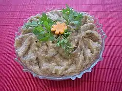 Malidzano is a traditional Macedonian spread made from puréed bell peppers, eggplant, oil, salt and mustard (optional). It derives its name from the Italian word for eggplant, melanzane. Malidzano is usually served as an appetizer with a side of bread like spread and piece of white cheese. In other countries of Western Balkans (Serbia, Bosnia and Herzegovina, Croatia), it is prepared with both green or red peppers so the color of the spread depends from that.