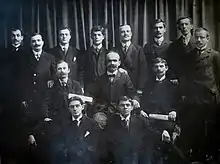 In the early 20th century. the New York area had become a destination for Albanians who sought economic and social prosperity outside the Ottoman Empire.[2] As the size of the Albanian community of the area and other parts of the United States grew, both the need and opportunity to better organize collaboration within the community became a focus of Albanian American intellectuals.[2][3] In this context, the Orthodox Christian members from the Albanian communities of Buffalo and Jamestown in New York State came together to found Malli i Mëmëdheut in January 1906.[4][5][6] Its founders were Albanian patriots from the region of Korçë, and included Petro Nini Luarasi,[7][8][9] Mina Grameno, Thanas Floqi, Kol Rikashi, Pandi Lipi Kallanxhiu, Thimi Nuni Boçka, Pandi Mihal Furxhi, Dhimitraq Zisi Negovani, Vani Odo Karameta, Vani Vangjeli, Thanas Halle, Mihallaq Kristaq Bimbli and Thanas Viso Mborja.[10] Its purpose was the protection and promotion of Albanian culture, and mutual assistance between Albanians in the country.[2] The members continuously organised meetings and activities, and jointly collaborated with Albanian intellectuals outside the United States, with the primary aim being helping the contemporary Albanian National Awakening that sought the creation of an Albanian state independent of the Ottoman Empire.[11] Malli i Mëmëdheut arranged for Fan Noli to be sent from Egypt, who after his arrival in the US (1906) became associated with the organisation and became a prominent member of the US Albanian community.[7][6][8] After growing gradually both in size and importance, in 1913 Malli i Mëmëdheut merged into Vatra, another prominent Albanian patriotic organisation in the United States.[2][10]