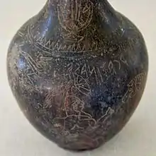 On the right side, stretching over the horse to the warrior is an incised inscription in Etruscan which reads from right to left, saying mi mamarce zinace. Mi is the first person singular nominative pronoun, mamarce is a male name in the nominative-accusative or locative case and zinace is a past active verb meaning "made". Because Mamarce only states his first name, it is assumed that he belonged to a lower social class. The name Mamerce is Italic, appearing in Latin as Mamercus and connected with Mamers, the Oscan name of the god Mars. That the potter who bore this name was himself ethnically Italiote need not follow.