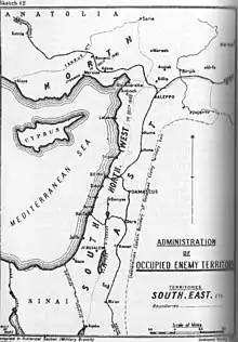 Around the same time, another secret treaty was negotiated between the United Kingdom and France (with assent by the Russian Empire and Italy) to define their mutually-agreed spheres of influence and control in an eventual partition of the Ottoman Empire. The primary negotiations leading to the agreement occurred between 23 November 1915 and 3 January 1916; on 3 January the British and French diplomats Mark Sykes and François Georges-Picot initialled an agreed memorandum. The agreement was ratified by their respective governments on 9 and 16 May 1916. The agreement allocated to Britain control of present-day southern Israel and Palestine, Jordan and southern Iraq, and an additional small area including the ports of Haifa and Acre to allow access to the Mediterranean.[24] The Palestine region, with smaller boundaries than the later Mandatory Palestine, was to fall under an "international administration". The agreement was initially used as the basis for the 1918 Anglo–French Modus Vivendi, which provided a framework for the Occupied Enemy Territory Administration (OETA) in the Levant.[25]