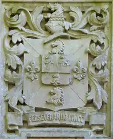 Walter Septimus Curtis (born 1871) was the owner of the estate in the early 1900s. He was lord of the manors of Denbury and of adjoining Newton Abbot and Newton Bushel.[28] He was a barrister of Lincoln's Inn and was educated at Trinity Hall, Cambridge.[29] He was the 3rd and youngest son of John Curtis (1836-1878) by his wife Juliana Davies, eldest daughter of John Davies of Manchester. Walter's grandfather was Matthew Curtis (1807–1887) of Thornfield in the parish of Heaton Mersey, Lancashire, the leading manufacturer of cotton-spinning machinery in Britain and thrice Mayor of Manchester.[30] Walter married Eleanor Francis Master, daughter and heiress of Robert Edward Master, JP, Madras Civil Service, of Hillingdon Furze, Uxbridge, Middlesex,[31] by whom he had one son, Robert Master Curtis (born 1920) and 6 daughters,[32] including Lettice Curtis (1915-2014) an aviator, flight test engineer, air racing pilot, and sportswoman.[33] Walter Curtis made substantial additions including the gatehouse[34] and the very high (5 metre) and very long boundary wall in which it is set, probably built between 1912 and 1914,[35] which stretches from the village of Denbury for several hundred yards along the roadside, past Denbury Green. His coat of arms (Per saltire argent and azure two horse's heads erased in pale gules and in fess as many fleurs-de-lys of the first[36] with inescutcheon of pretence for Master Azure, a fess embattled between three griffin's heads erased or[37]) is sculpted on a stone tablet above the inner entrance of the gatehouse.