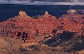 Manu Temple is a 7,184-foot-elevation (2,190 meter) summit located in the Grand Canyon, in Coconino County of northern Arizona, United States.[2] It is situated one mile south of the North Rim's Widforss Point, 1.5 mile (2.4 km) northeast of parent Buddha Temple, and three miles southwest of the North Rim's Bright Angel Point. Topographic relief is significant as it rises nearly 3,600 feet (1,100 meters) in two miles above Bright Angel Canyon to the east, and 2,200 feet in less than one mile above Haunted Canyon to the immediate west. Its neighbors include Brahma Temple and Deva Temple to the east on the opposite side of Bright Angel Canyon. From the South Rim of the canyon it may be difficult to discern Manu Temple from the walls of the Kaibab Plateau one mile behind it, but when the lighting and atmosphere are favorable, this butte of great proportions can be seen clearly defined.[3]