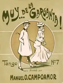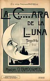 Campoamor's 1901 tango, "La cara de la luna" (in English "The Face of the Moon"), originally bore a different name. The cover on the original sheet music displays the title as "La C.....ara de la L...una" with the dots indicating the missing letters from the original title, which was considered too vulgar to put into print. The original title was "La concha de la lora" with "concha" and "lora" being the lunfardo words for "vagina" and "prostitute" respectively.[4] It is commonly reported that tango originated in the slums and bordellos of Buenos Aires.[5] The original title of this early tango is a testament to that legacy.
