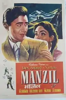 Manzil (lit. 'Destination') is a 1960 Bollywood film directed by Mandi Burman. It stars the popular duo Dev Anand and Nutan in the leading roles. Krishan Dhawan, Achala Sachdev and K.N. Singh star in supporting roles. It was declared "average", taking the seventeenth spot at highest grossing, earning 760,000 rupees at the box office.[1]