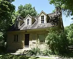 The first park land was purchased in 1921 by the Maquoketa Women's Club for the purposes of establishing a state park. Originally called Morehead Caves State Park, its name was changed to Maquoketa Caves in 1928.[4] Additional land was acquired in 1931. The majority of the park facilities were constructed from 1932 to 1939 by the Civilian Conservation Corps (CCC) and the Works Progress Administration (WPA). Both programs resulted from the federal government effort to make work for Americans during the Great Depression. Their work makes up the contributing properties of the historic district. They include three CCC overlook shelters, the entrance portals, the custodian's residence, the shelterhouse/concession building, the stone picnic circle, and two stone latrines. The noncontributing structures in the park include the CCC/WPA cave improvements, the CCC/WPA trail system, the park ranger's residence, a picnic shelter, and two wood-frame latrines.[4] State Landscape Architect John Fitzsimmons designed the custodian's residence. It and the other historic structures designed by the Central Design Office in Ames, Iowa were built in the Rustic style, which was promulgated by the National Park Service in the 1930s as being appropriate for parks.[4]
