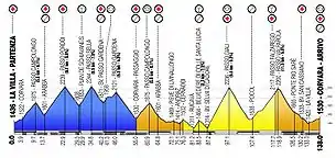 The race is divided into three courses of varying difficulty: the Sellaronda course, the Middle course and the Maratona course. All riders start at 6:30 am in the village of La Ila and complete the four pass Sellaronda course first. After completing the Sellaronda course riders can either choose to finish the race or proceed directly onwards with the Middle course. As the Maratona course is an extension of the preceding shorter Middle course, riders doing the full Maratona dles Dolomites have to proceed with the Middle course.[3] All three courses go through the Dolomite mountains around the Sella Group and over roads, the Giro d'Italia have taken place. The roads are lined with thousands of spectators and the event is broadcast live on Italian national broadcaster RAI.[1][4] Along the courses seven refreshment stations are manned by volunteers, with foods and drinks, varying from sports drink to coffee to Strudel or Speck sandwiches.