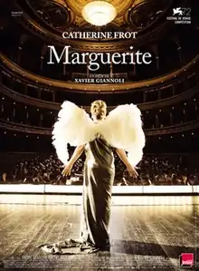 Marguerite is a French/Czech/Belgian 2015 comedy and drama film directed by Xavier Giannoli and written by Giannoli and Marcia Romano, loosely inspired by the life of Florence Foster Jenkins. Set in the Golden Twenties, the film stars Catherine Frot as a wealthy woman who is an enthusiastic amateur singer and believes, wrongly, that she has a beautiful voice. The film is an international co-production among France, the Czech Republic, and Belgium.[3] Marguerite received eleven nominations at the 41st César Awards, winning for Best Actress, Best Costume Design, Best Sound, and Best Production Design.[4]