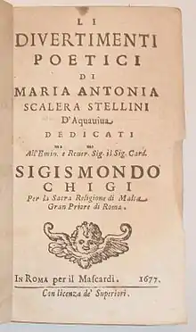 In 1677, in Rome, she published a collection of poems in two volumes entitled Li divertimenti poetici ("The poetic entertainments"), which was reprinted in 1706. She also published the plays and musical dramas La Tirannide abbattuta dal trionfo della fede, Serenata spirituale, La ninfa del Tebro, Il trionfo di sant'Agata and Il Coraspe redivivo. The latter was staged in Ariccia in 1683.[3]